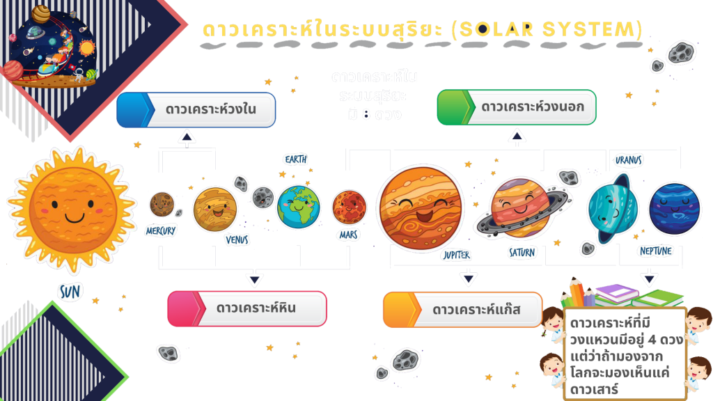 บนท้องฟ้ามีดวงดาวมากมาย จากภาพข้างบนผู้เรียนทราบหรือไม่ว่าคือภาพอะไร ใช่แล้วค่ะ มันคือภาพระบบสุริยะ แล้วผู้เรียนทราบหรือไม่ว่า ระบบสุริยะประกอบไปด้วยเทหวัตถุชนิดใดบ้าง แล้วมีขนาดกว้างแค่ไหน คำถามทั้งหมดนี้มีคำตอบแน่นอนค่ะ คาบเรียนนี้เราจะไปท่องโลกอวกาศด้วยกันนะคะ ว่าแล้วก็อย่ารอช้า เราไปตะลุยอวกาศกันเลย